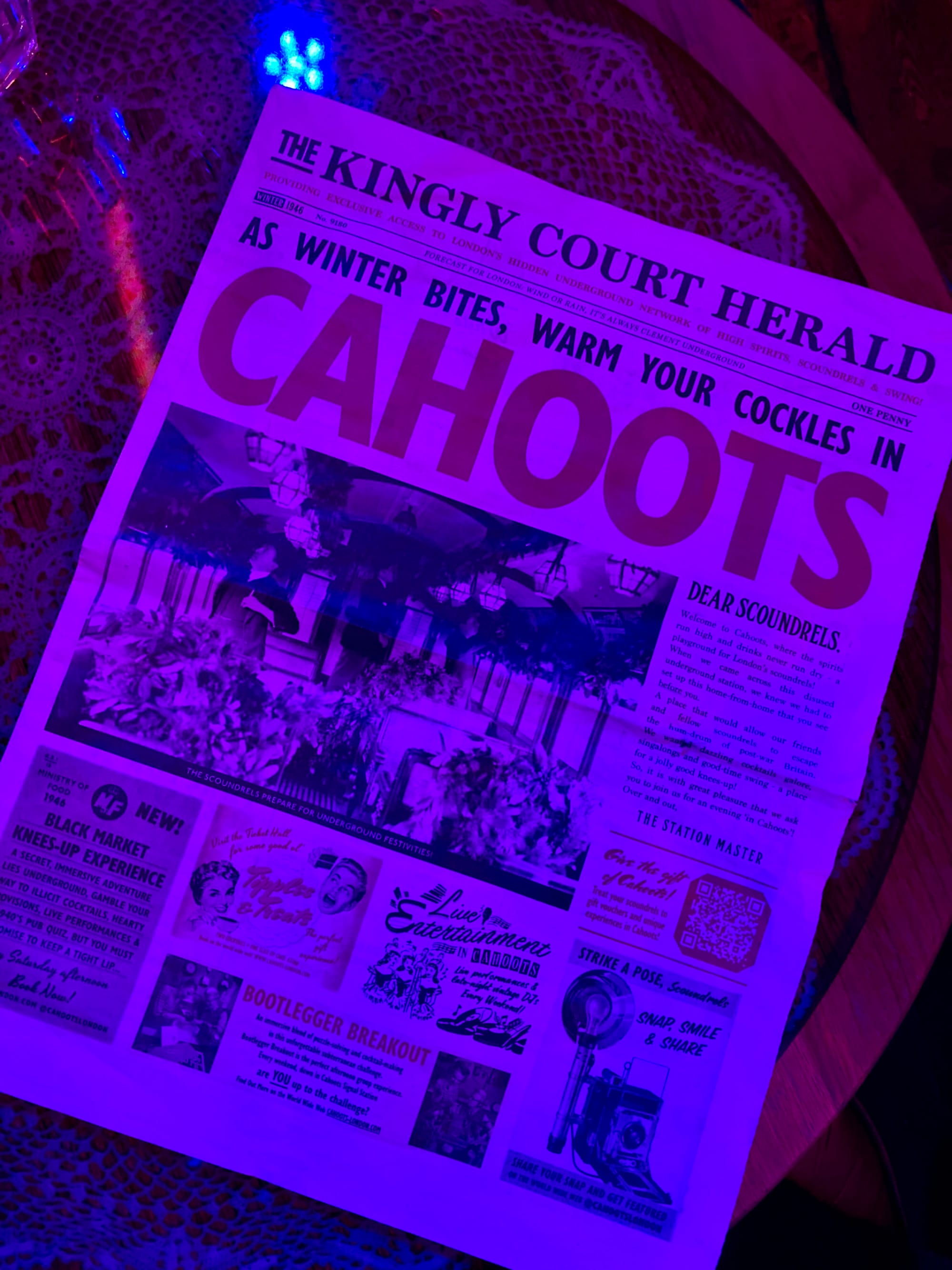 Cahoots is a theatrical cocktail bar set in what feels like an old Underground station, complete with tiled platforms, a life‑size tube carriage, wartime signage and vintage props that whisk you back to post‑war Britain.