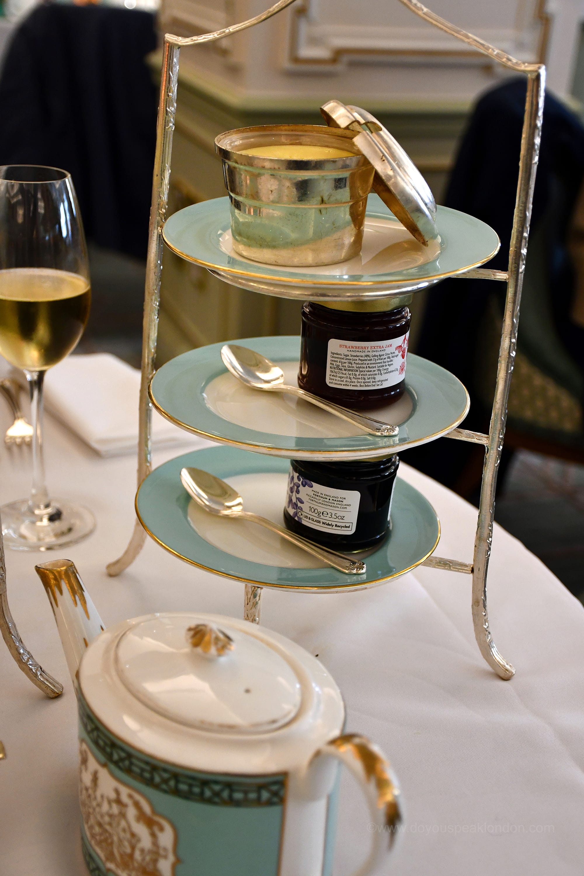 Next came the plain and fruit scones, served with Fortnum’s Strawberry and Wild Blueberry Preserves and rich Somerset clotted cream.