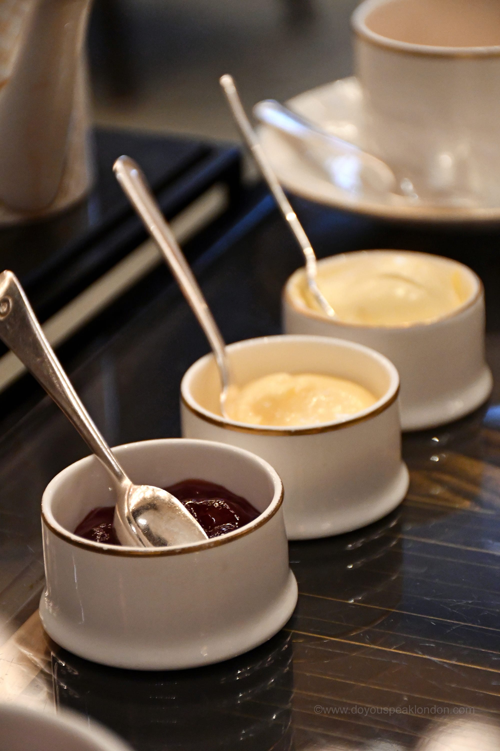 They were served with Cornish clotted cream, zesty lemon curd, and homemade strawberry & elderflower jam.