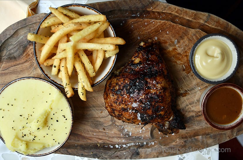 Two of us opted for the cheeky lunch, comprising chicken (with a choice of quarter chicken, picked chicken, or vegan popcorn chicken), two sides or salads, and two classic sauces. The meals arrived promptly, and we couldn’t wait to dig in when they were served on their wooden boards!