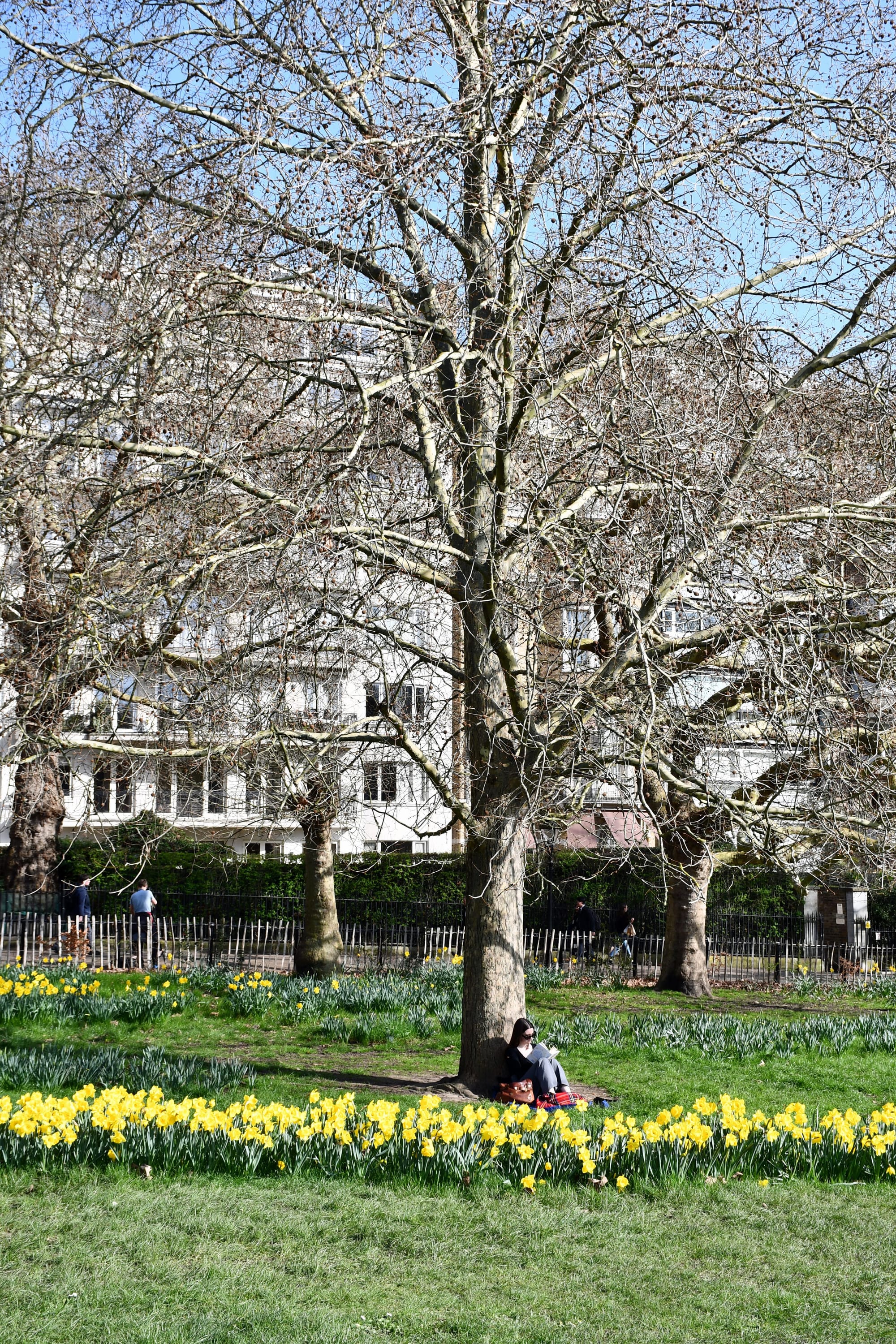 They bloom naturally under the trees, giving a peaceful and classic London spring feel.