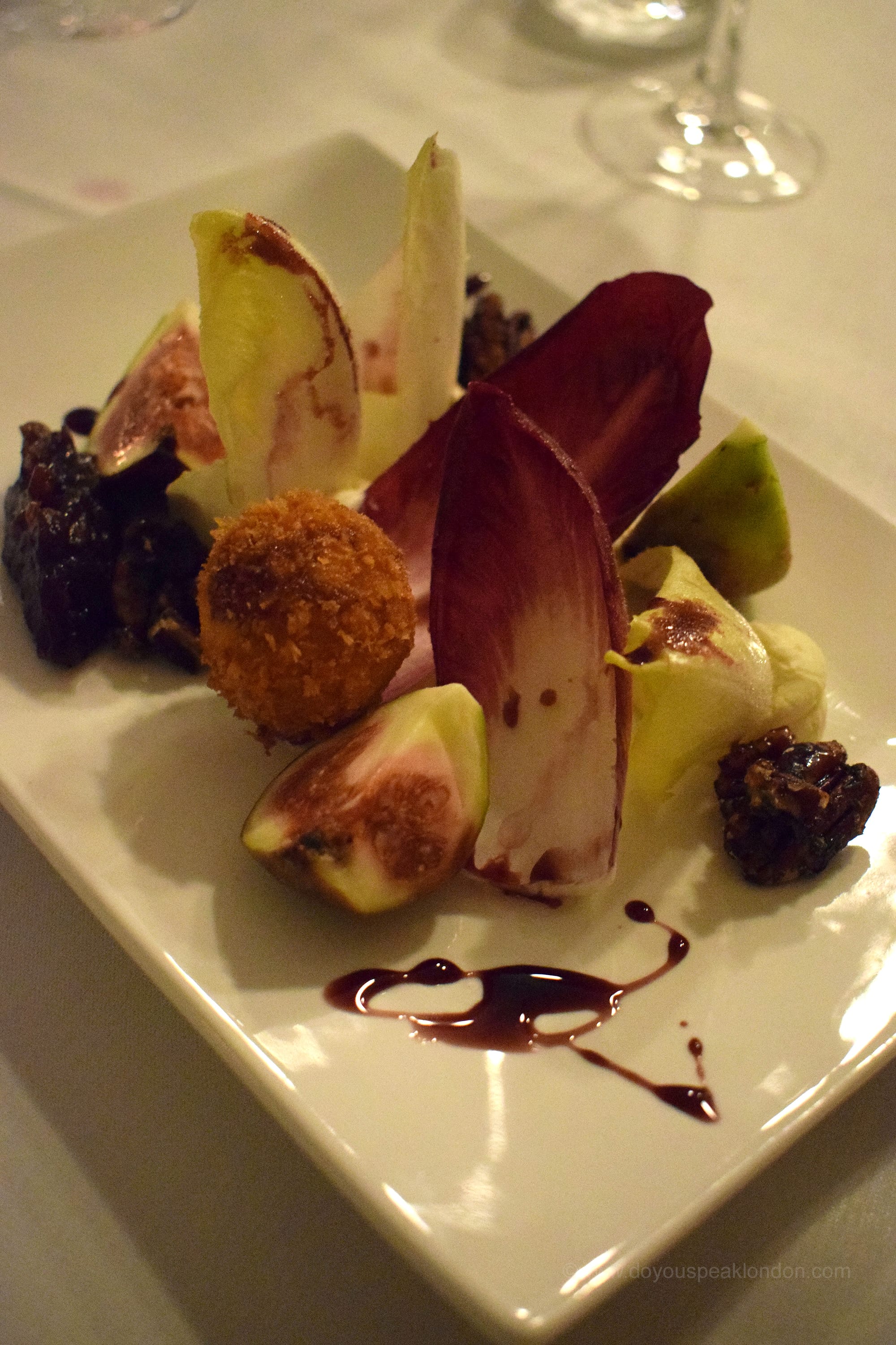 My starter, a salad of endives, figs, goat cheese, and candied pecans, was exquisitely fresh and flavourful.