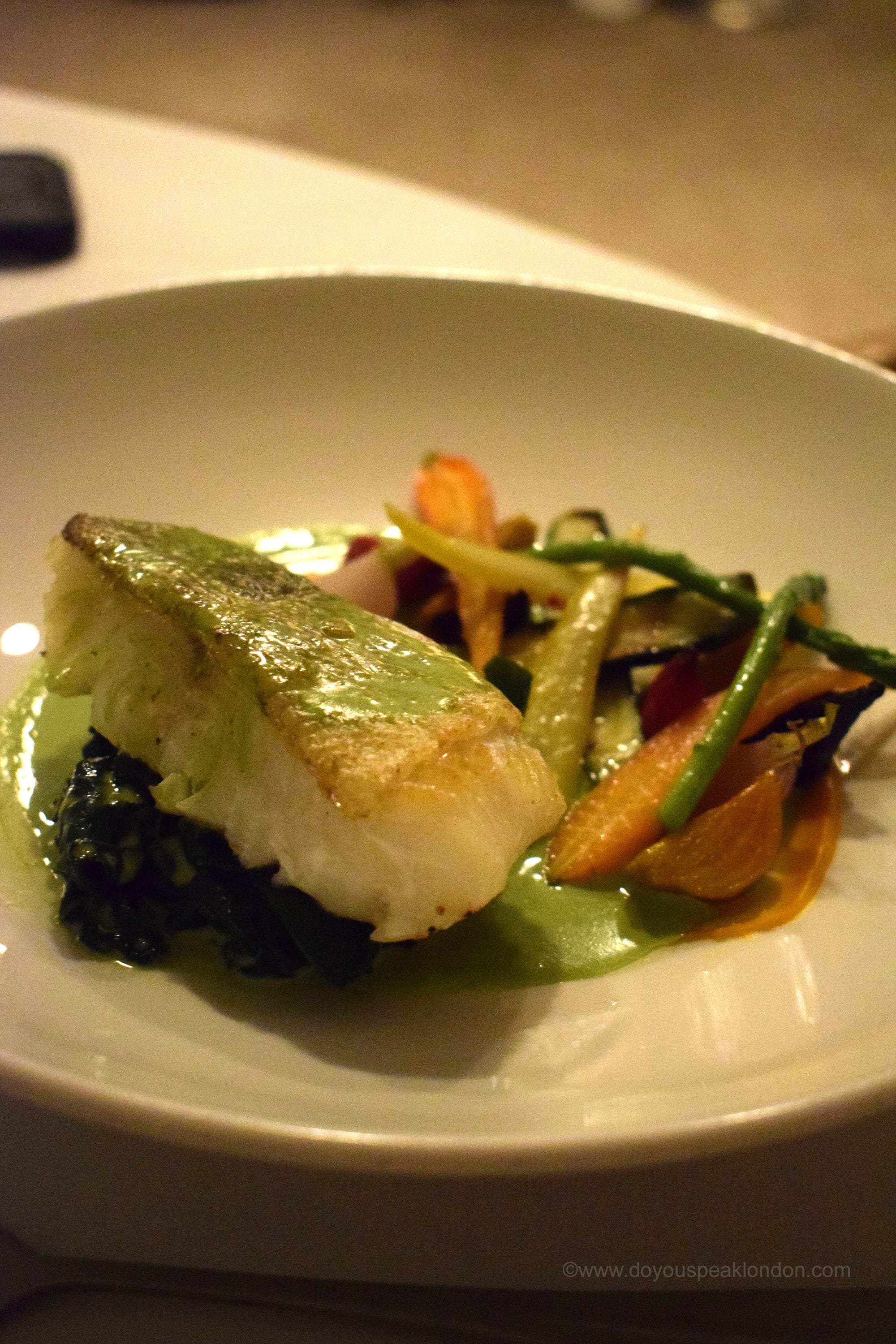 The main, pan-fried seabass with sautéed spinach, saffron potatoes, and asparagus, was perfectly cooked.