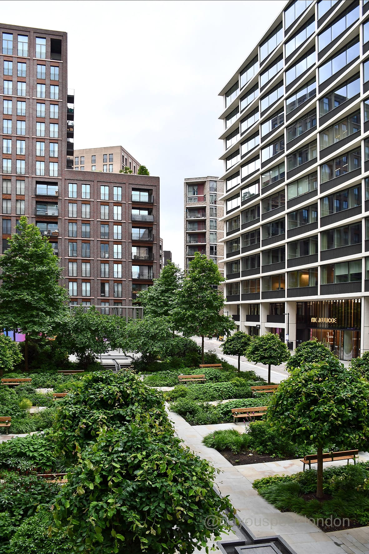 It’s a mix of modern landscaping and industrial charm, with plenty of seating areas and greenery that make it feel both contemporary and peaceful.