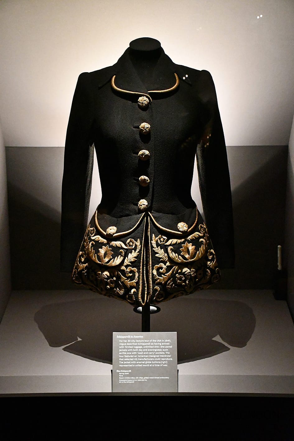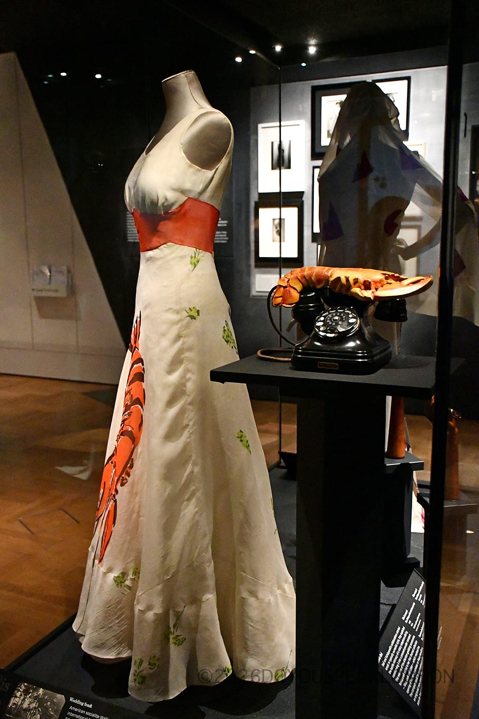 The display shows how Schiaparelli consistently pushed fashion into more imaginative territory, blending clothing with art and surrealism in unexpected ways.