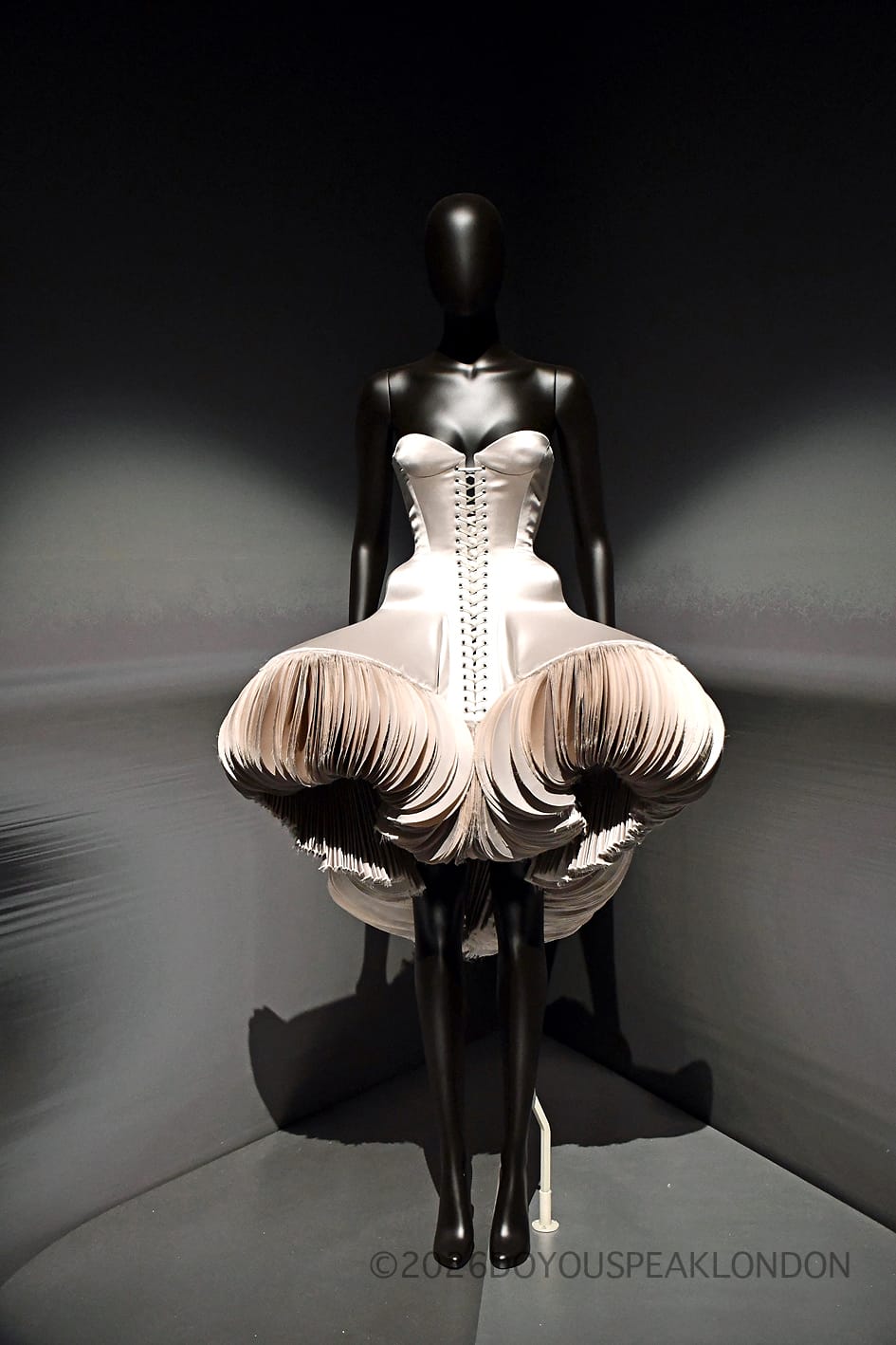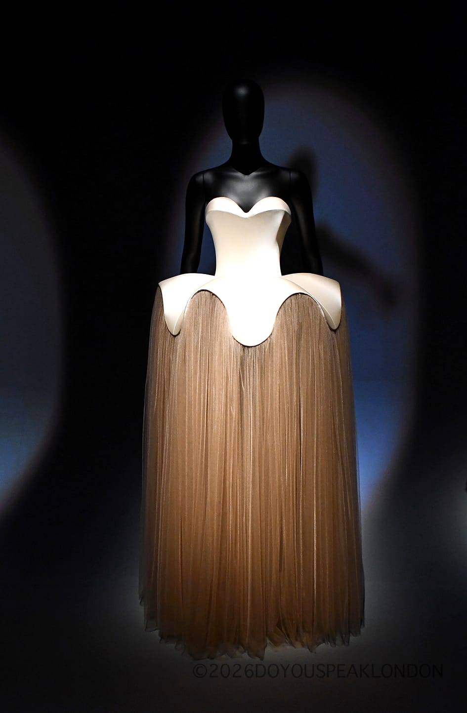 Highlights include the iconic Tears Dress and Skeleton Dress, both created in collaboration with Salvador Dalí. Alongside these historic pieces, more recent designs, including Ariana Grande’s 2025 Oscars gown, highlight the continued influence of the house today.