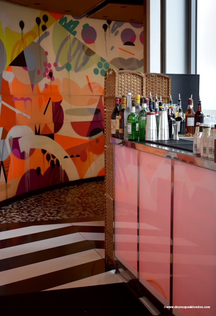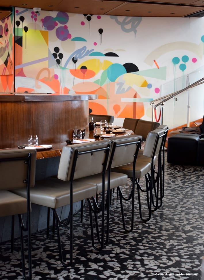 I like the choice for vibrant colours, contrasting with the darker colours from the furniture and floor. The graffiti installation is from Brazilian Street Artist Flip, and mixes all cultures from the SushiSamba’s concept.