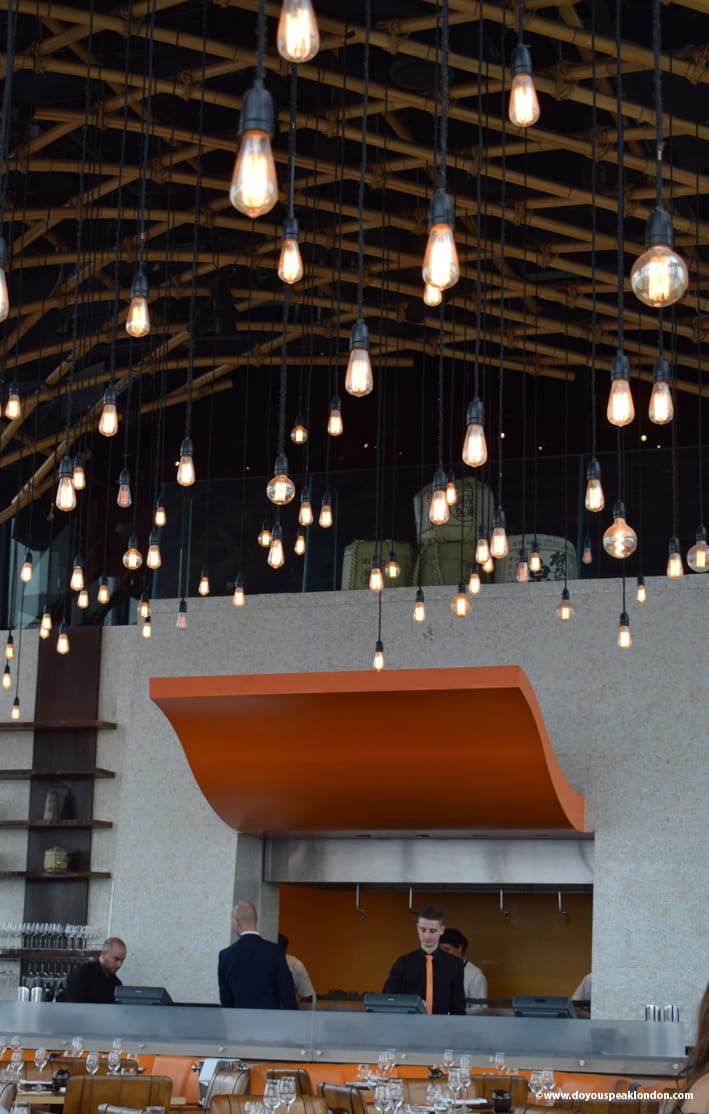 Black and orange are obviously SushiSamba’s colours. The bamboo is also part of the decor and the lights hanging from the open bamboo ceiling create a singular and contemporary atmosphere.