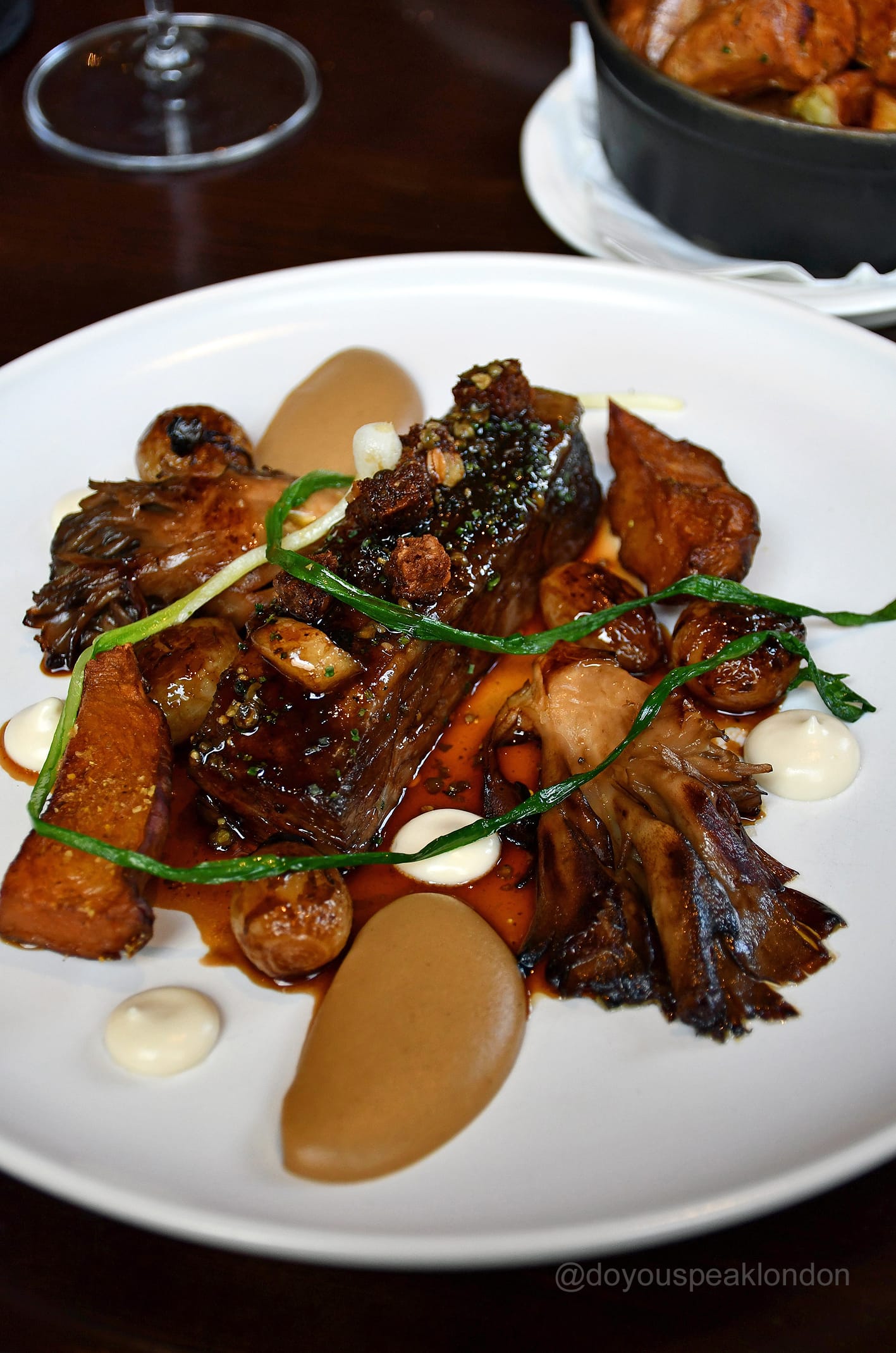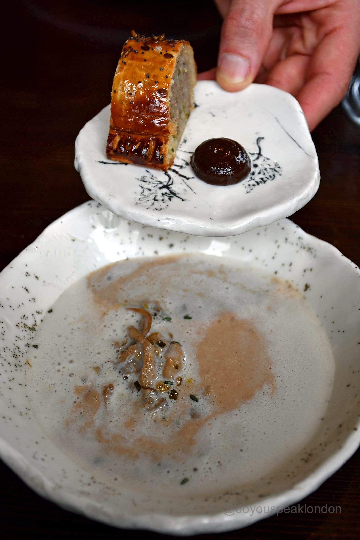 The second starter (though not the easiest to photograph!) was seriously delicious: a rich chestnut soup packed with deep, earthy flavours of mushroom and tarragon with a wild boar sausage roll. Honestly, I would have enjoyed it just as much without the sausage roll. The soup was so flavourful on its own!