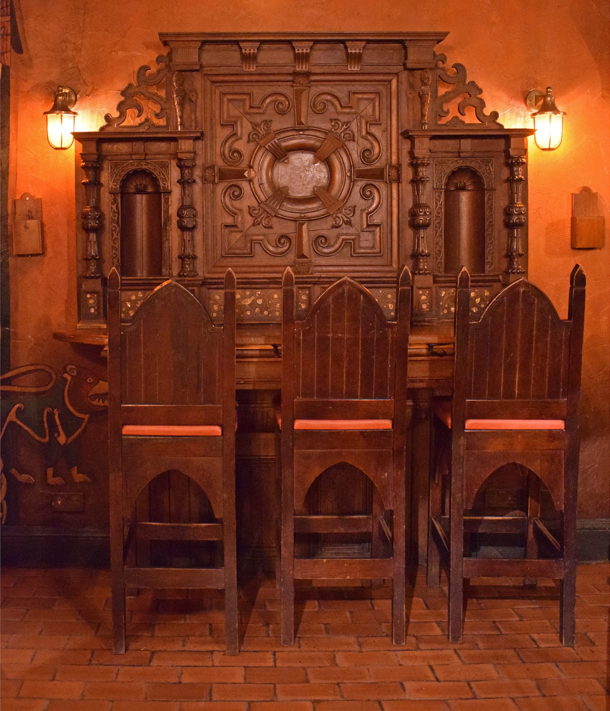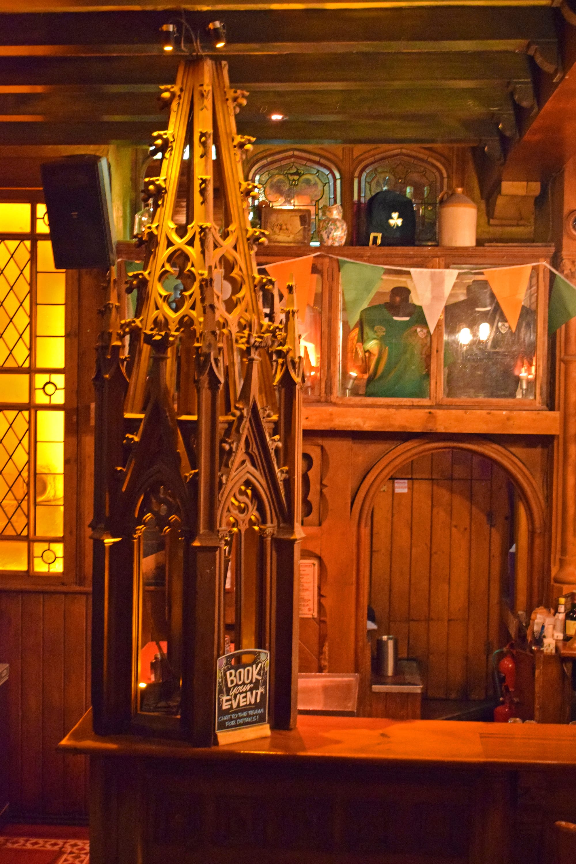 You can enter the pub from either Wardour Street or Rupert Street, and the moment you step inside, it feels like walking into a grand old church, with ornate wooden panels, stone walls, stained glass windows, and cushioned pews, or perhaps a Harry Potter set, full of quirky props and hidden corners.