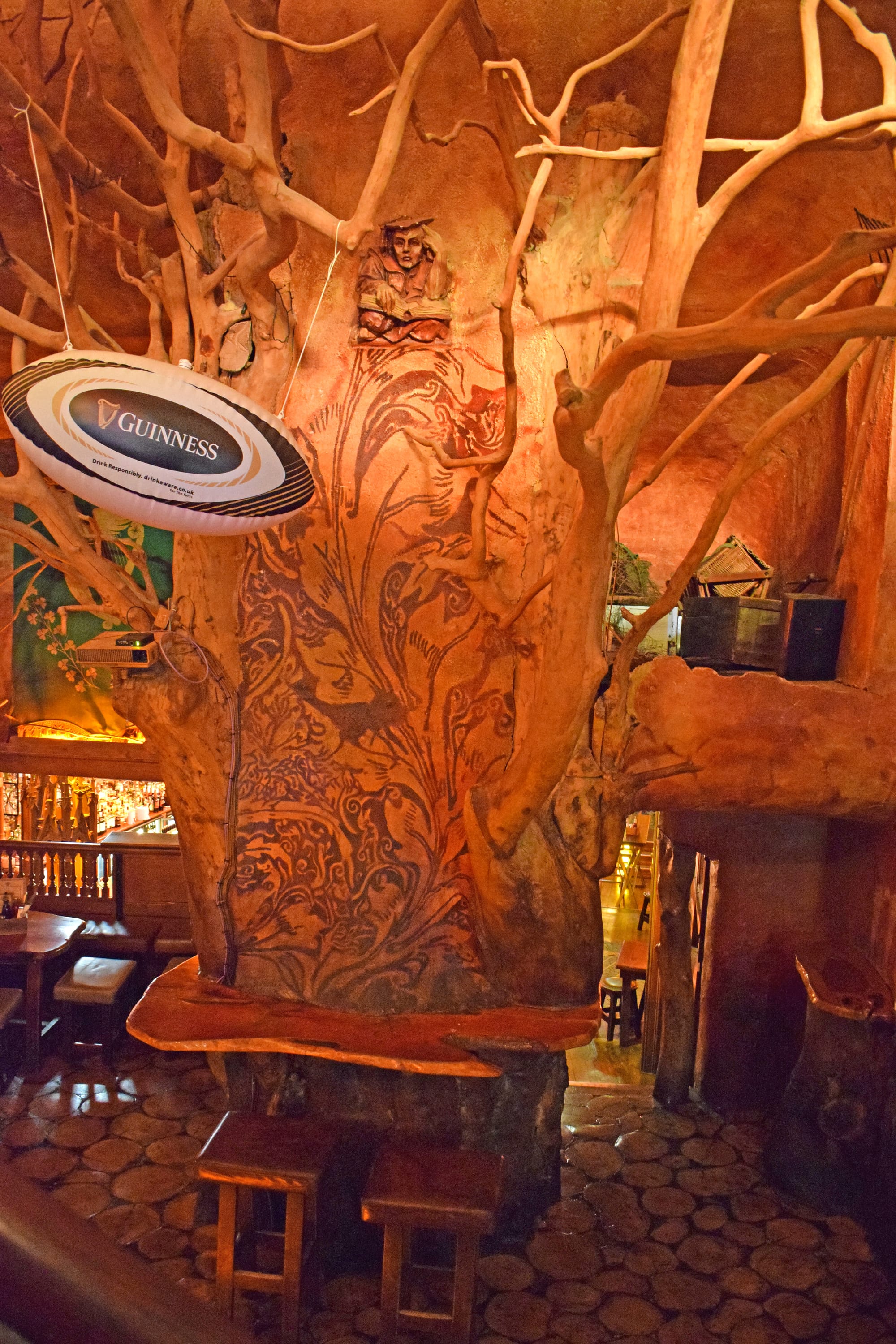 The pub has four bars spread across six levels, with numerous nooks, corridors, and staircases. One of the most surprising features is a preserved tree with its trunk and branches rising from the lower floor.