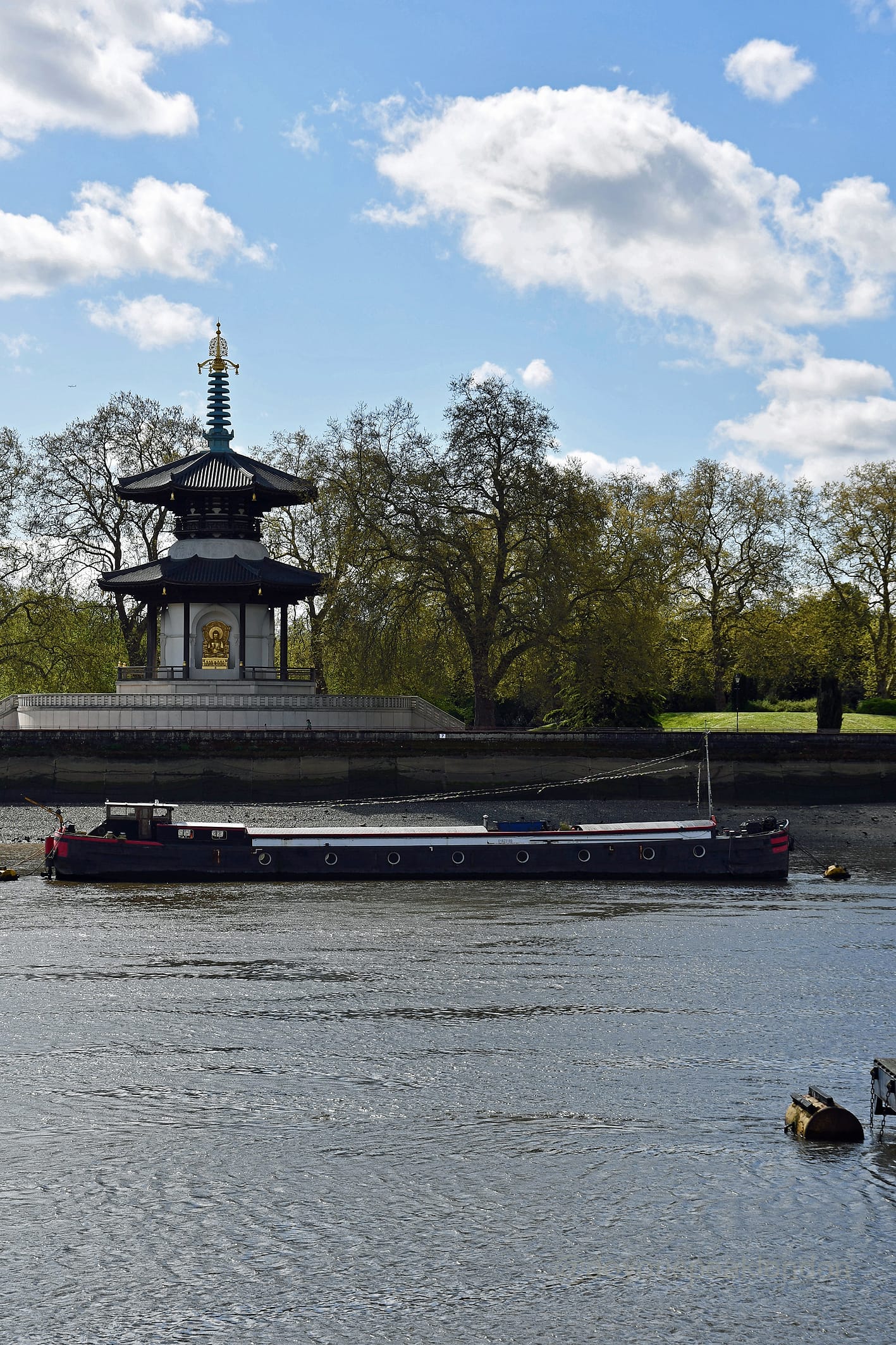 Across the Thames, you’ll spot the striking Battersea Park Peace Pagoda. It’s a beautiful golden-roofed monument gifted by Japanese Buddhists in the 1980s as a symbol of peace. It adds a serene, unexpected touch to the riverside view.